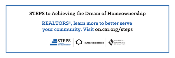 .The CALIFORNIA ASSOCIATION OF REALTORS® STEPS Toward Homeownership addresses housing affordability from the perspective of financial literacy. Did you know over half of all renters in California thought you needed at least 20% down to purchase a home? The reality is there are programs available that enable a purchase with much lower down payments.  This program brings relevant information to our members about credit scores, financial planning, leveraging down payment resources and options for low to moderate income earners so that we can educate our buyers. The CALIFORNIA ASSOCIATION OF REALTORS® supports RESPONSIBLE Homeownership.